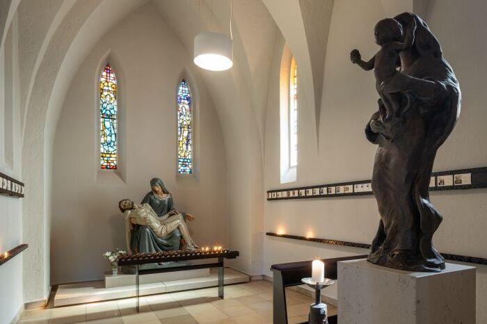 In der Kirche Maria Schutz gibt es den "Raum der Stille" in der Marienkapelle. Er bietet einen geschützten Rahmen für mein stilles Gebet und Gedenken.