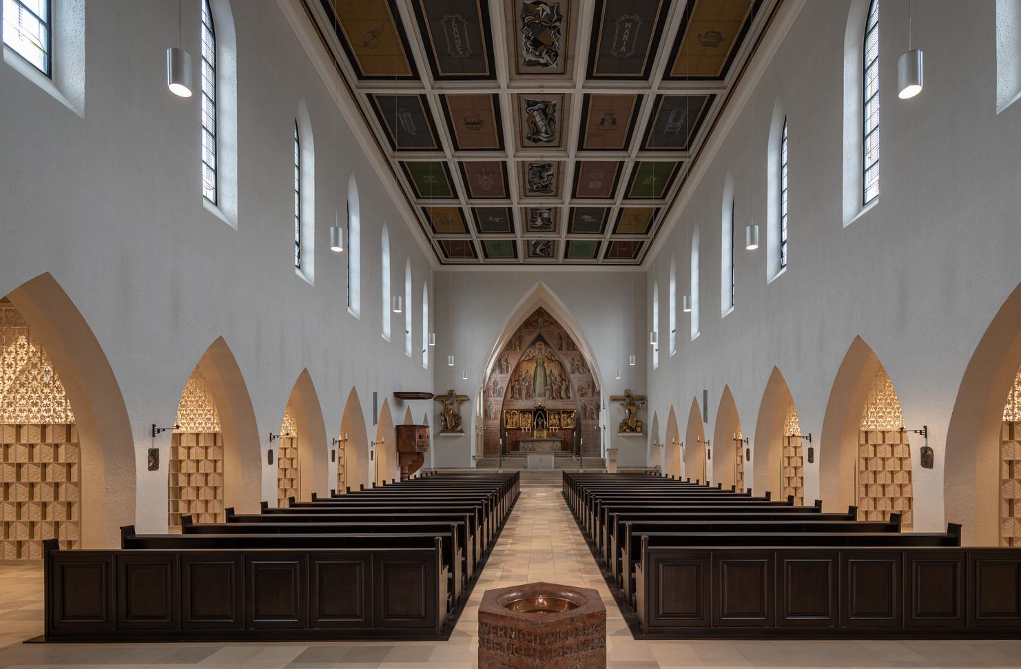 Das Kolumbarium befindet sich jeweils in den beiden flachgedeckten Seitenschiffen. Die Urnenwände werden orthogonal zur Außenwand in den Öffnungen der Querbögen verortet. Durch diese Anordnung entstehen 10 Kapellen, die sich respektvoll in die denkmalgeschützte Sakralarchitektur integrieren. Die Kapellen erhalten die Namen Cäcilia, Elisabeth, Klara, Maria, Blasius, Christ-König, Franziskus, Josef, Laurentius und Norbert und schaffen für die 1.320 Urnenkammern einen würdigen Ort des Gedenkens und der Intimität. Eine übergreifende Idee für das Kolumbarium ist ein eigens dafür entworfenes Ornament, das unterschiedlich interpretiert wird. Die Urnenwände sind aus Stahl gefertigt und lösen sich nach oben in eine mit dem Ornament versehene filigrane Struktur auf. Durch die Struktur hindurch wird der Spitzbogen sichtbar und mit einer integrierten Illumination betont. Verschlossen werden die Kammern mit handgefertigten, glasierten Keramiktafeln die das Ornamentthema aufgreifen und alternierend angeordnet der Urnenwand ein fast gewoben anmutendes Gewand verleihen. Gewachste Messingtafeln mit Inschrift vergegenwärtigen die Verstorbenen.