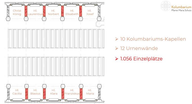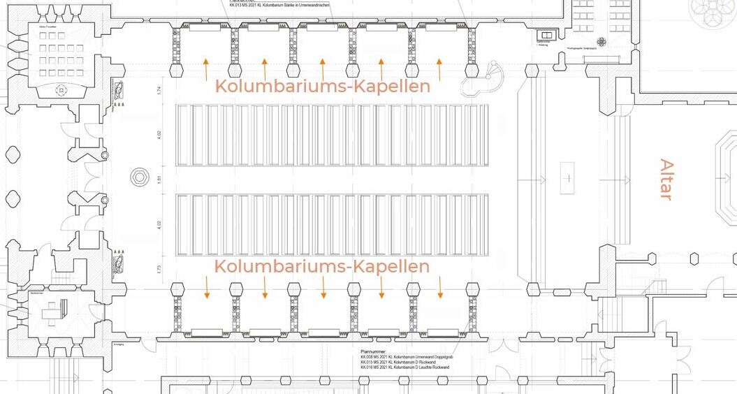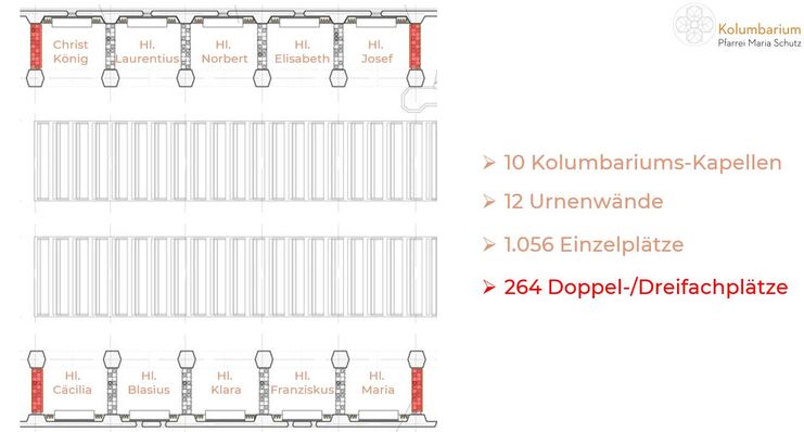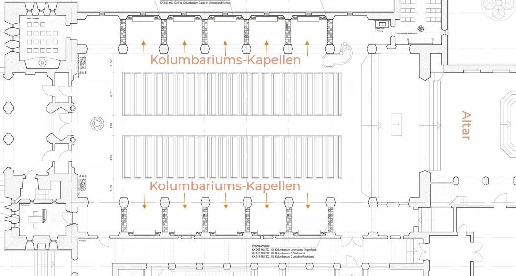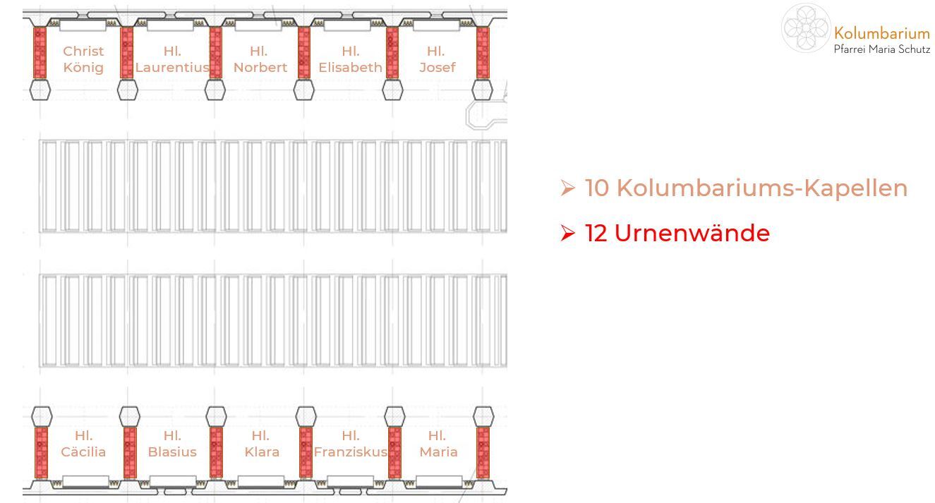 Die Urnenwände bilden jeweils den rechten und linken Abschluss einer Kapelle. Die nach Osten gerichtete Kapellenwand (Richtung Altar) heißt immer "Alpha"- und die nach Westen "Omega"-Wand.