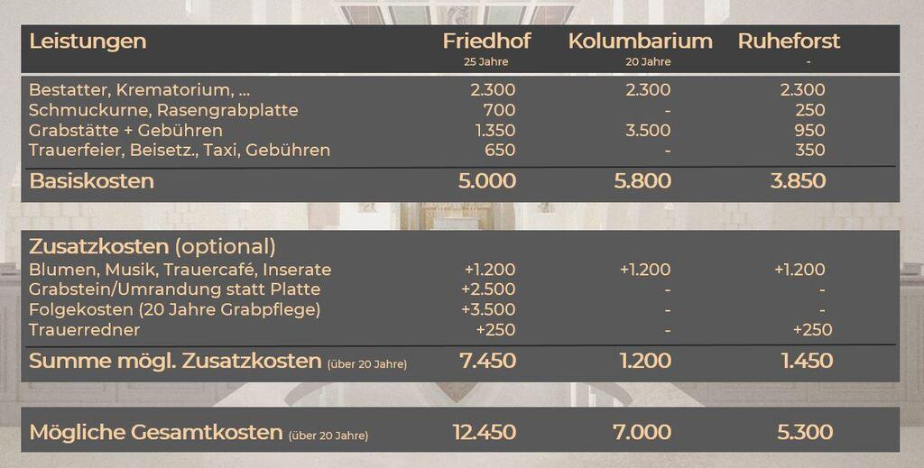 Betrachtet man die Kosten inklusive durchaus üblicher optionaler Zusatzkosten, bietet das Kolumbarium Maria Schutz - neben weiteren Vorteilen - auch eine witschaftliche Alternative zur Bestattung auf dem Friedhof.