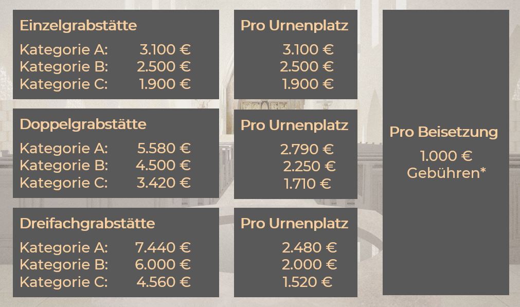 * Diese Gebühren fallen grundsätzlich erst mit der Beisetzung an. In den 1.000 € sind u. a. die Grablegung, der Abschluss der Urnenkammer mit einer künstlerisch gestalteten, handgefertigten Keramikplatte, ein Messingschild inkl. Inschrift und ein seidenes Urnentuch enthalten. Darüber hinaus werden damit die Ewigkeitskammer sowie ein Teil der Verwaltung und des Kolumbariumsbetriebs finanziert.